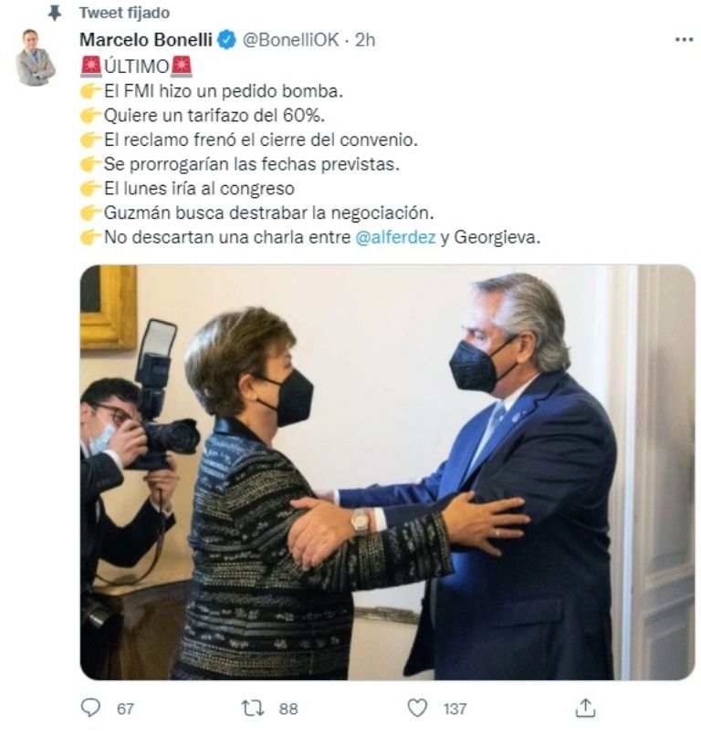 Según el periodista, "El FMI hizo un pedido bomba. Quiere un tarifazo del 60%. El reclamo frenó el cierre del convenio. Se prorrogarían las fechas previstas. El lunes iría al congreso. Guzmán busca destrabar la negociación. No descartan una charla entre @alferdez y Georgieva".