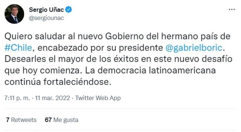 Hecho 2: Sergio Uñac fue el único gobernador invitado por Casa Rosada para formar parte de la exclusiva comitiva que estuvo en el acto de asunción del nuevo presidente chileno Boric.