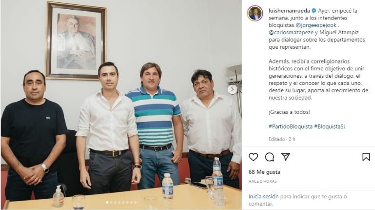 Por otro lado, Rueda empezó esta semana con una ronda de consultas en los departamentos. Inició visitando las comunas con intendentes bloquistas como son Jorge Espejo en Iglesia, Carlos Maza Pezé en Angaco y Miguel Atámpiz de Zonda.