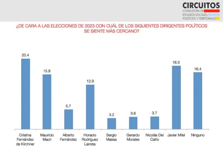 En el trabajo realizado en la provincia de Buenos Aires, quién sigue encabezando las preferencias es Cristina Fernández de Kirchner, con 20.4% de las adhesiones. La sigue el libertario Javier Milei con 18.3% y algo más lejos el ex presidente Mauricio Macri, con el 15.3%.