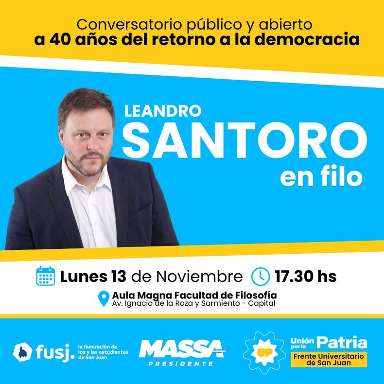 El diputado nacional y ex candidato a jefe de Gobierno porteño, Leandro Santoro, llegará a San Juan para dar una charla en un evento organizado por el Frente Universitario Unión por la Patria y será en la Facultad de Filosofía Humanidades y Artes de la UNSJ.