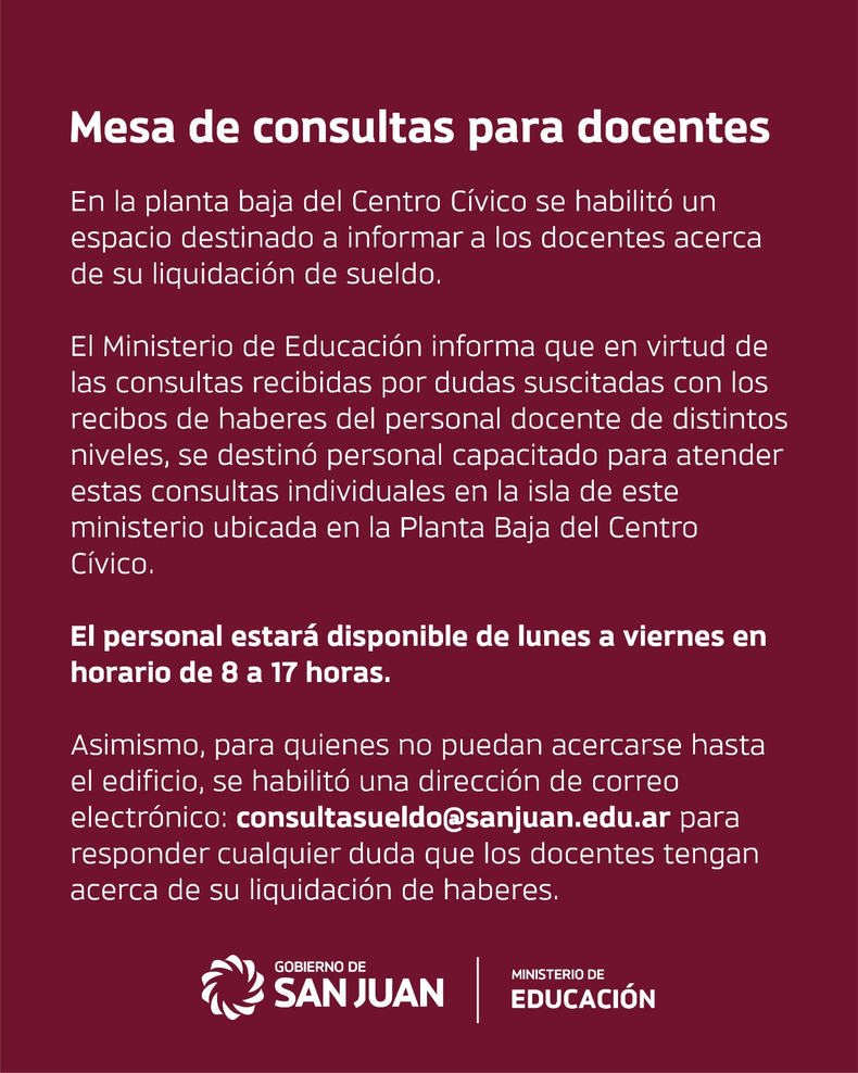 El Ministerio de Educación comunicó, que en virtud de las consultas recibidas por dudas suscitadas con los recibos de haberes del personal docente de distintos niveles, se destinó personal capacitado para atender estas consultas individuales en la isla de este ministerio ubicada en la Planta Baja del Centro Cívico.