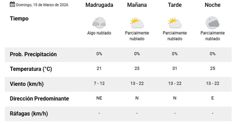 El Servicio Meteorológico Nacional anticipa para este domingo en San Juan una jornada agradable, con cielo algo nublado en la madrugada que irá despejando hacia la mañana. La mínima será de 21° y la máxima alcanzará los 31°, con sol imponiéndose y elevando la temperatura durante el día.