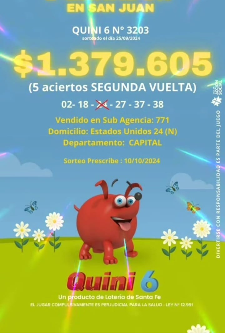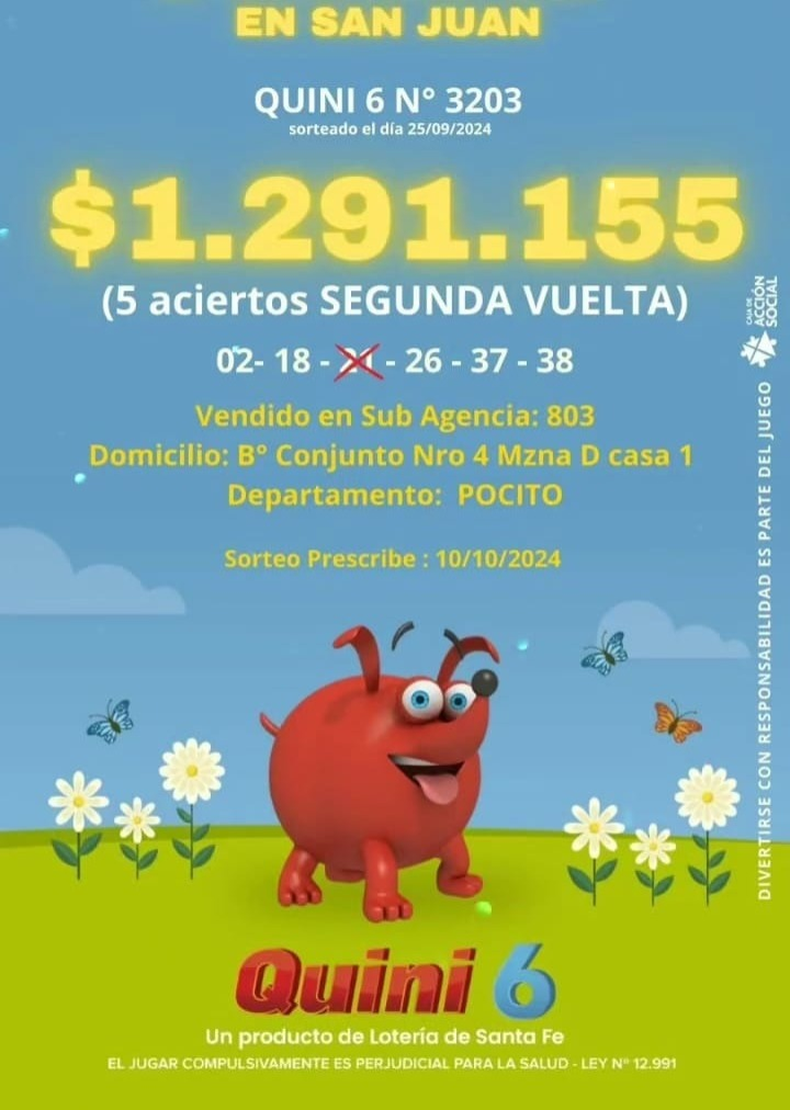 El sorteo de este miércoles del Quini 6 trajo suerte a dos sanjuaninos que se quedaron con premios millonarios por acertar 5 números de la modalidad Segunda Vuelta. La información fue difundida por la Caja de Acción Social de la provincia, desde donde indicaron que uno de los apostadores compró su cartón en una agencia de Capital y el otro, en un local de Pocito.