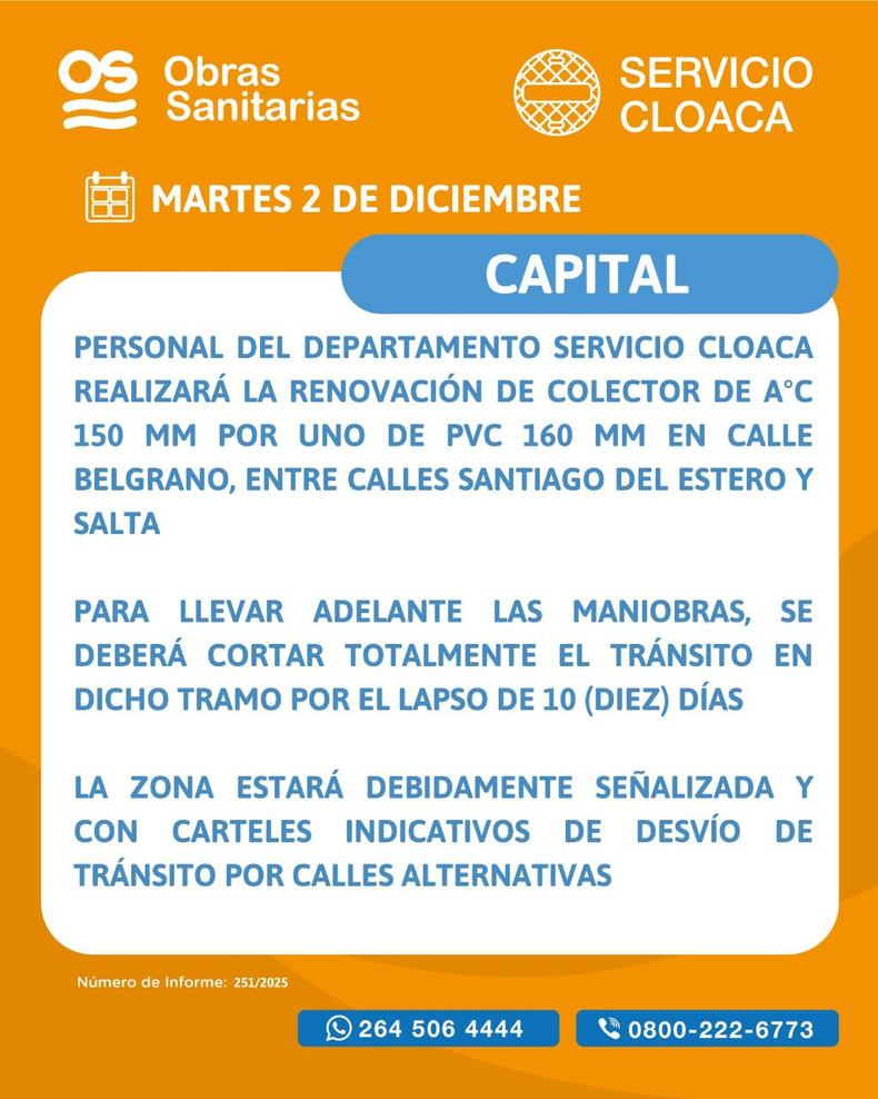 Obras Sanitarias Sociedad del Estado (OSSE) comunicó que a partir de este martes 2 de diciembre, y por el lapso de 10 días, realizará trabajos de renovación de cañería en calle Belgrano, entre calles Santiago del Estero y Salta.