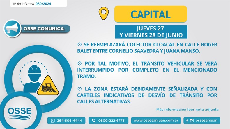 OSSE programó maniobras de reemplazo de colector cloacal en calle Roger Balet entre Cornelio Saavedra y Juana Manso. Las tareas se ejecutarán durante este jueves 27 de junio y se extenderán hasta el viernes 28 de junio inclusive, viéndose interrumpida por completo la circulación del tránsito vehicular.