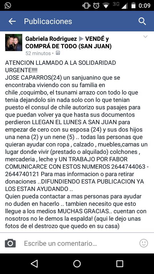 Darío le creó con una imagen de Facebook y fotos que enviaron los damnificados una movida a través de Whatsapp, en donde solicita que los sanjuaninos le den una mano a José y a su familia, tanto con muebles como con ropa, alimentos y hasta trabajo.