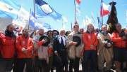 Detrás de los primeros jinetes llegó la columna encabezada por el gobernador Sergio Uñac, acompañado del ministro del Interior, Rogelio Frigerio y un grupo de expedicionarios. Era a quien todos esperaban para comenzar con el emotivo acto. Sonaba la marcha de San Lorenzo y al llegar al lugar todo fue emoción otra vez. Las autoridades chilenas recibieron a las sanjuaninas y se cantó el himno del país vecino.