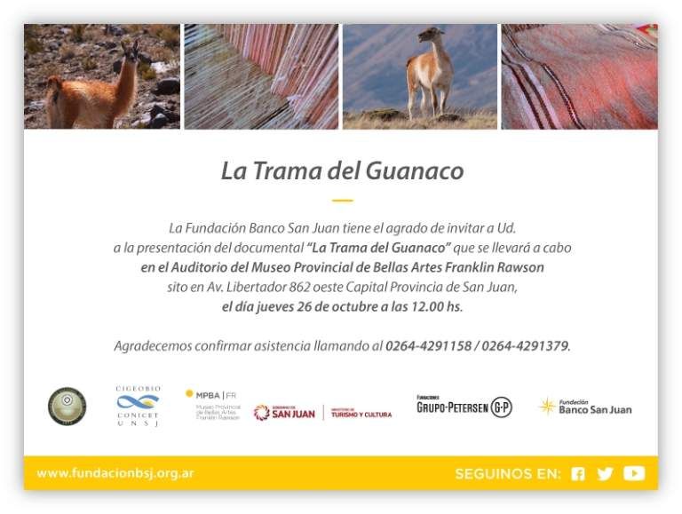 Mañana 26 de Octubre a las 12.00, en el Auditorio del Museo de Bellas Artes Franklin Rawson, Fundación Banco San Juan invita a la presentación del Documental llamado “La Trama del Guanaco”, un audiovisual, con duración de 29 minutos, en el cual se trata de reflejar los aspectos desconocidos de las poblaciones de guanacos, su conservación y sus necesidades ambientales.