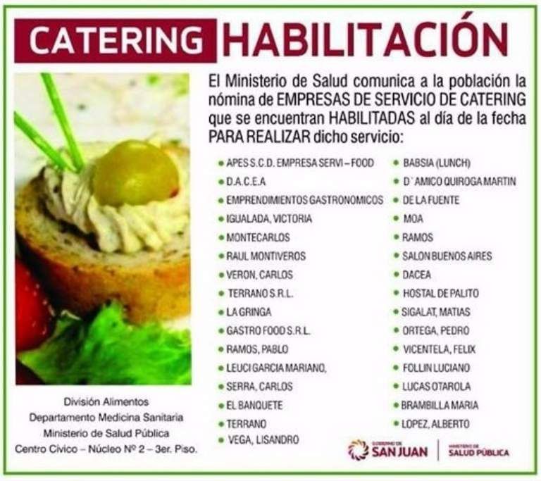 La cercanía con el fin de año provoca un boom de almuerzos y cenas y es por eso que el Ministerio de Salud Pública de San Juan puso al conocimiento de toda la sociedad la lista de empresas de catering habilitadas para llevar adelante este tipo de acontecimientos.