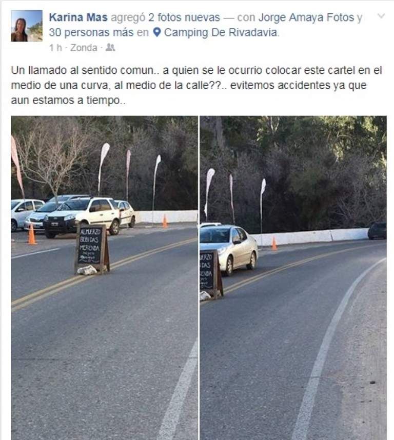 Se trata de una pizarra que un comerciante colocó en medio de la ruta en la zona de la conocida curva de los tontos en Rivadavia. En el letrero ofrece meriendas y comidas al paso.