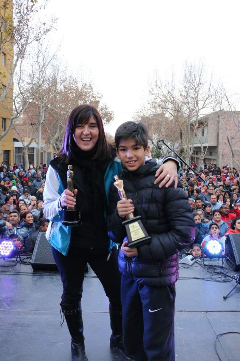 Marcela Podda y Gustavo Toledano, los dos conductores del noticiero permiado con el Martín Fierro de Oro, exhibieron el premio frente a una multitud.