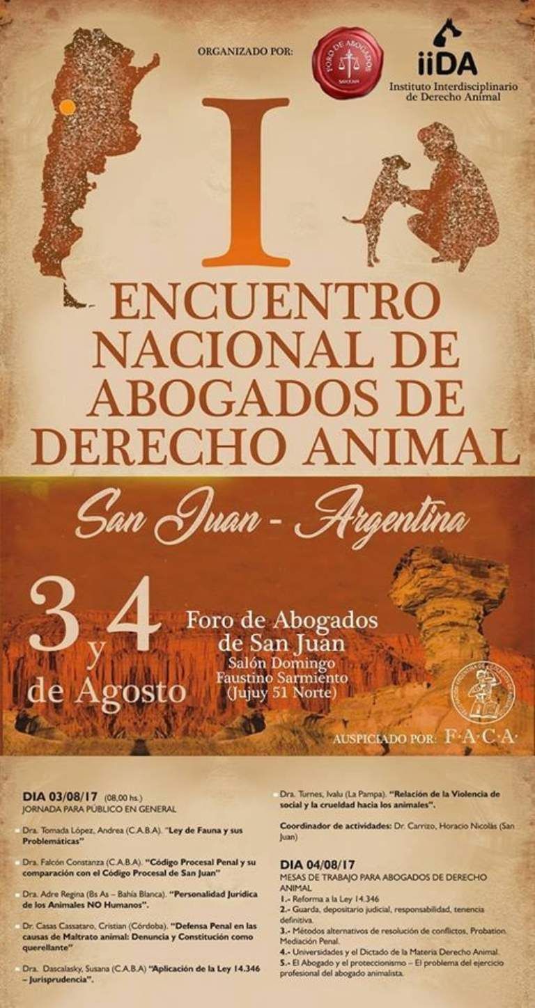 El Primer congreso de Abogados de Derecho Animal ya tiene sede : será en la provincia de San Juan los días 3 y 4 de agosto del corriente año en el Salón Domingo Faustino Sarmiento, ubicado en calle Jujuy 51 (N) Capital.