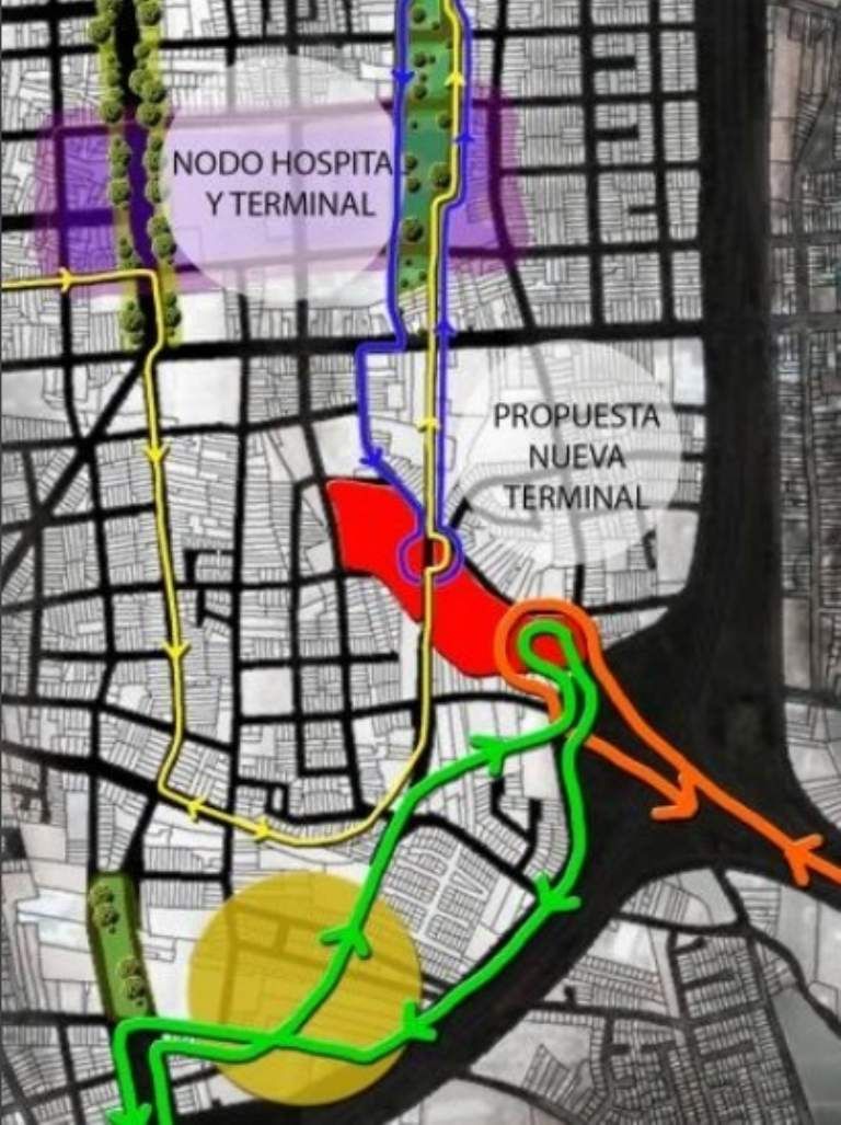 La propuesta contempla la refuncionalización de la Terminal existente, con el mantenimiento del servicio de colectivos intraurbanos (corta distancia). Se prevé la refuncionalización de la Terminal existente, con un nuevo edificio dos o tres niveles de fluida interconexión con el hospital, que albergue funciones recreativas (cines, patios de comidas, compras) y que brinde posibilidad de expansión de descanso para familiares de internados en el Hospital.