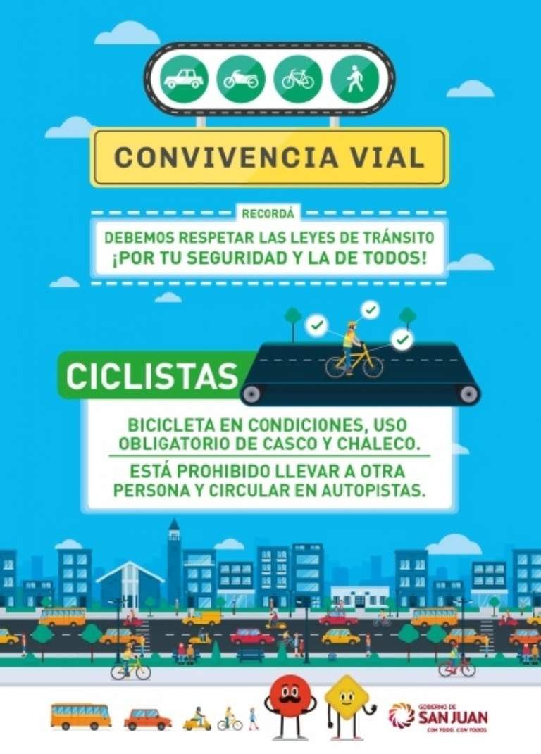 El Gobierno de San Juan, a través de sus reparticiones especializadas, y asociaciones de ciclistas de la provincia idearon de manera conjunta el 'Plan de Convivencia Vial para Ciclistas y Automovilistas', una suerte de reglamentación que pronto entrará en vigor para que se pueda ver en las calles sanjuaninas una adecuada interacción entre los vehículos motor y las bicicletas. Intentando, además, que se reduzcan o, en el mejor de los casos, extingan los lamentables accidentes o contratiempos que habitualmente los tiene como protagonistas.