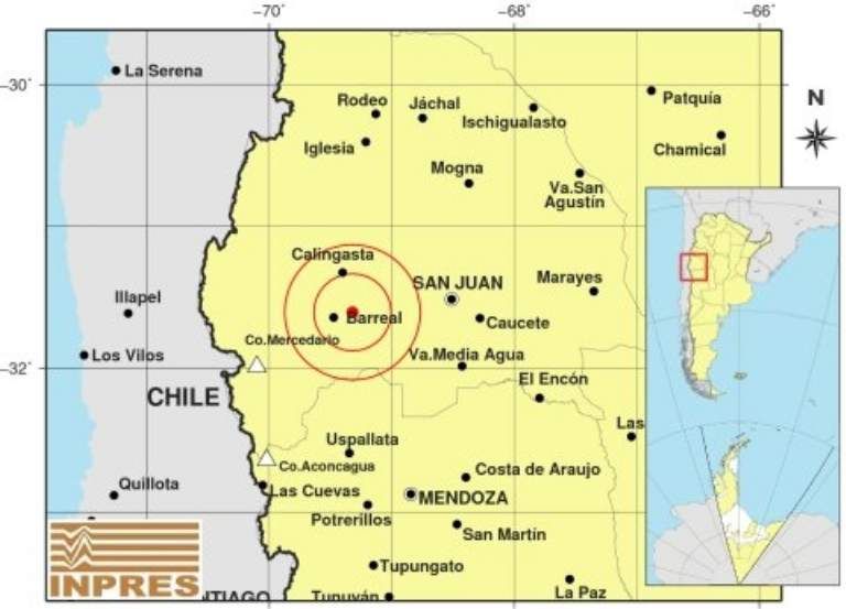 Epicentro: 78 km al O de San Juan, 147 km al N de Mendoza, 15 km al E de Barreal. -31.610 (lat) -69.320 (long)