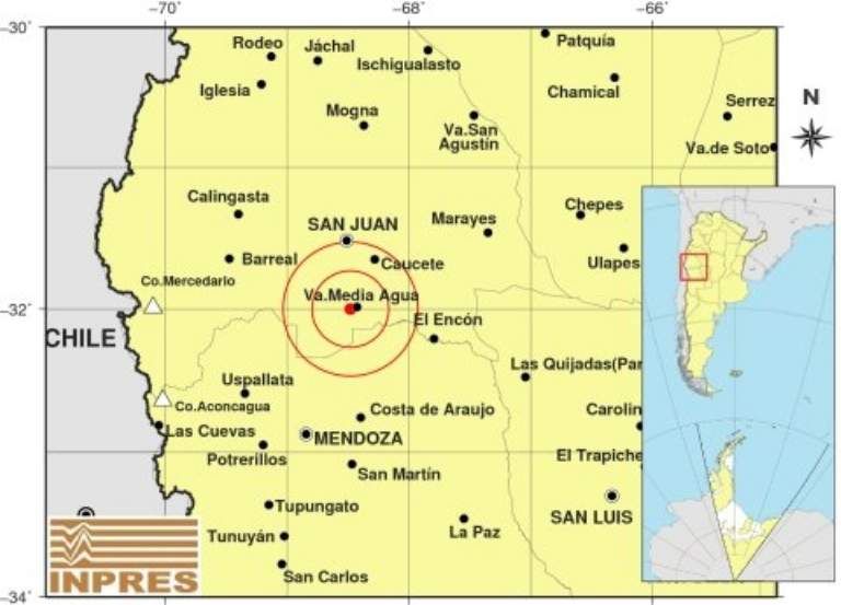 Epicentro: 54 km al S de San Juan, 102 km al N de Mendoza, 6 km al O de Va.Media Agua. -32.000 (lat) -68.480 (long)