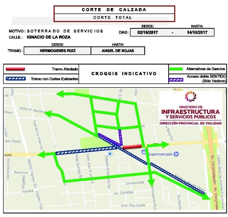 SUSCRIBITELa Dirección Provincial de Vialidad (DPV) informó un nuevo corte en avenida Ignacio de la Roza para los días 2, 3y 4 de octubre. Las alternativas de desvío son las siguientes:
