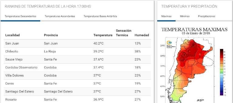 San Juan, según indicó la página del Servicio Meteorológico Nacional, se convirtió en la ciudad más caliente de este jueves en todo el país con 40,2º grados registrados a las 17.00 hs. Según las previsiones, mañana, la llegada de un frente sur, daría algo de respiro y ubicaría la máxima en 30º.