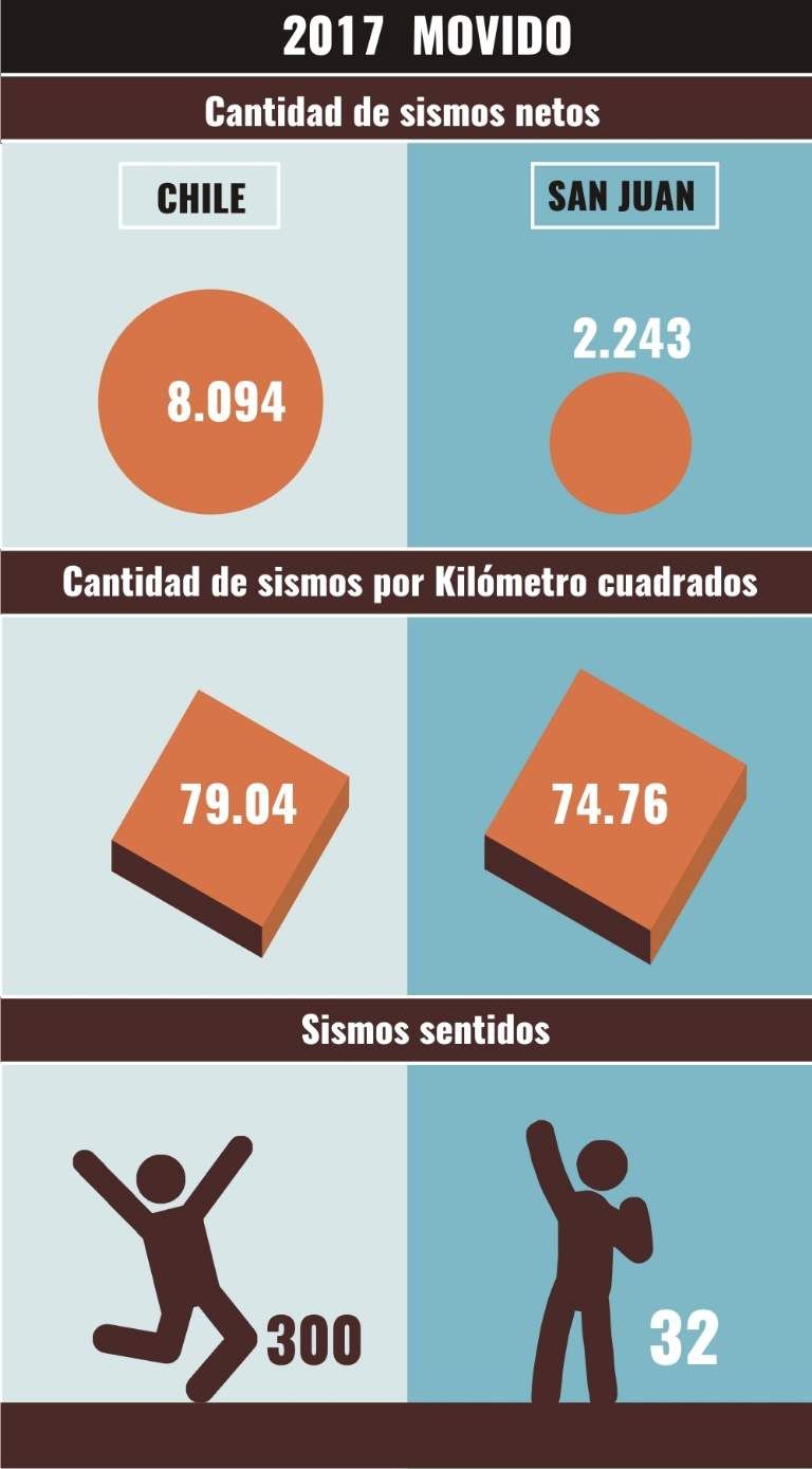 Donde Chile sí pasa a ser una “potencia sísmica” en comparación con San Juan es en la cantidad de sismos sentidos. Es que de los 8094 sismos, más de 300 fueron percibidos por los habitantes del país vecino.