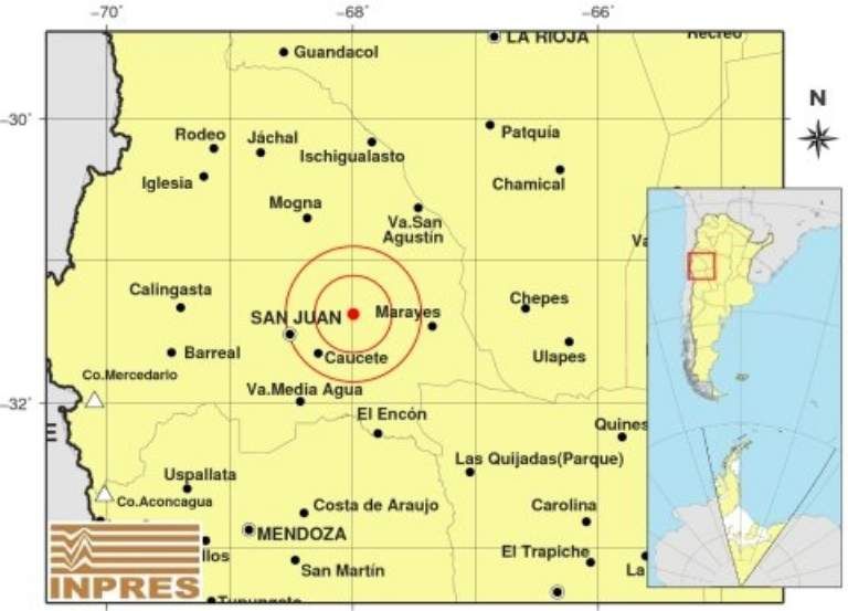 Epicentro: 51 km al E de San Juan, 184 km al NE de Mendoza, 38 km al NO de Bermejo. -31.377 (lat) -67.994 (long)