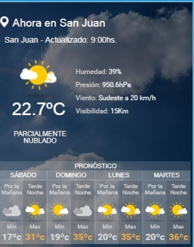 El Servicio Meteorológico Nacional pronostica para la jornada de este sábado una temperatura mínima de 17º y una máxima de 31º. Además, prevé cielo parcialmente nublado o nublado y vientos regulares del sector sur con ráfagas, por la mañana, y nubosidad variable y vientos moderados a leves del sector sur, rotando al sector este, por la tarde noche.