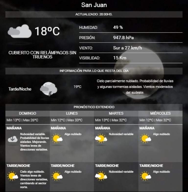 Para la tarde, las condiciones climáticas mejorarían, según indica el Servicio Meteorológico Nacional. El cielo se man tendrá con nubes pero con mayor presencia del sol. Sin embargo, los vientos se tornarían al sector norte para las últimas horas de la jornada. Con la presencia de un vientito Zonda, el loco clima sanjuanino podría sorprender a todos otra vez.