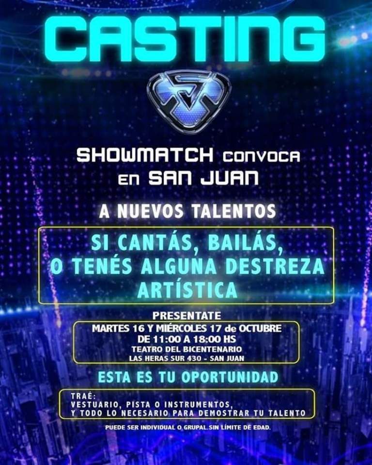 Un nuevo casting en la búsqueda de nuevos talentos sanjuaninos para Showmatch se realizará el martes 16 y miércoles 17 de octubre en el Teatro del Bicentenario. Podés presentarte en forma individual o grupal y debés llevar tu vestuario o instrumentos musicales.