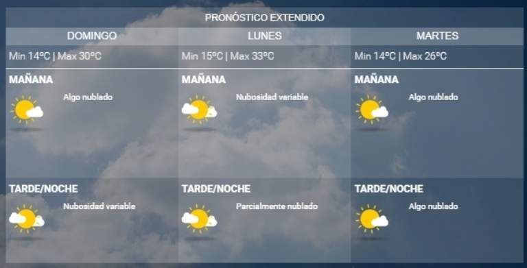 El Servicio Meteorológico Nacional anuncia para este sábado una máxima de 28º. Por la mañana se espera nubosidad variable y vientos moderados a regulares del noreste, con ráfagas. En tanto que para la tarde el cielo estará parcialmente nublado o algo nublado, también con vientos regulares del noreste y ráfagas en disminución.