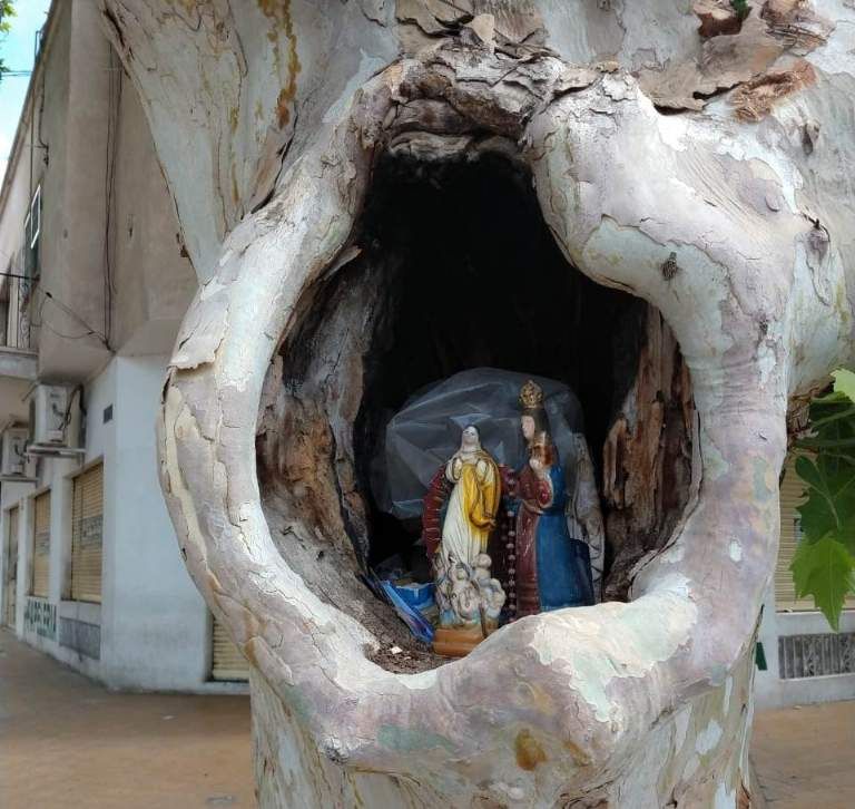 En una especie de hueco natural en el tronco de un plátano, alguien decidió colocar la imagen de la Virgen. Poco a poco se fueron agregando más imágenes religiosas, estampitas y velas. Es impactante ver gente en ese humilde lugar rezando, persignándose o agradeciendo por un amor encontrado, por la salud recuperada o simplemente por un día más de vida. La descripción no responde a la imaginación de esta cronista, que descubrió el altar saliendo del súper y para hacer la nota pasó horas en la plaza Gertrudis Funes observando fieles, sino a los testimonios recogidos allí.
