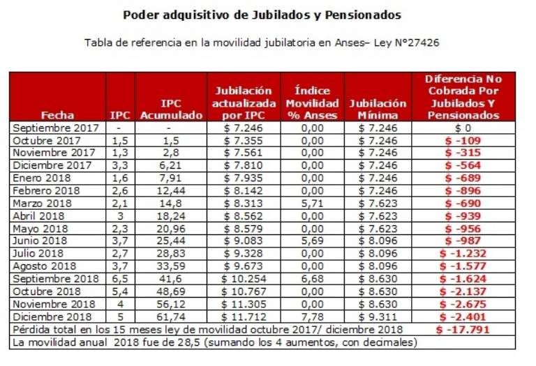 Según datos oficiales por la Dirección de Asesoramiento Previsional de la provincia y teniendo en cuenta una inflación que rondará el 48% en este 2018 (estimaciones oficiales de nación); $17.791 será la pérdida en los 15 meses octubre 2017- diciembre 2018 de aplicación de la ley de movilidad de la ultima reforma previsional. Esto significará el detrimento de 20 puntos porcentuales solo en este año y apenas un 28.5% en 2018 el aumento en estos últimos 15 meses.
