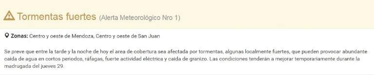 El Servicio Meteorológico Nacional publicó en su página web un alerta por una fuerte tormenta que podría visitar el centro y oeste de San Juan esta tarde-noche. Según indicó, se espera abundante caída de agua, con posibilidad de granizo y mucha actividad eléctrica.