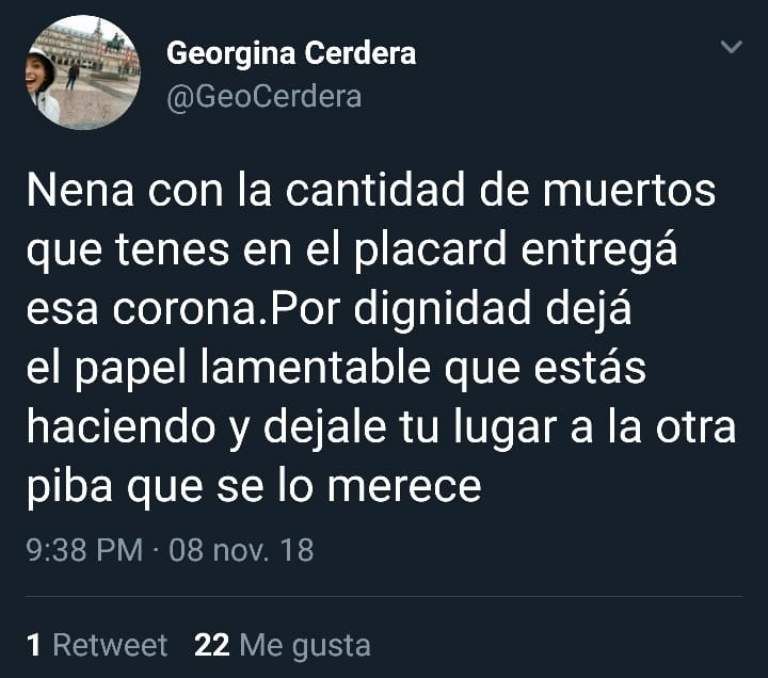 En un tremendo descargo en su cuenta de Twitter, la ex reina del departamento capitalino le mostró las credenciales a la joven investigada por dos delitos y le pidió que, si tiene dignidad, que renuncie no sólo por lo que la investigación penal le atribuye -mientras se desconoce si es culpable o inocente- sino por el pasado que ostenta.