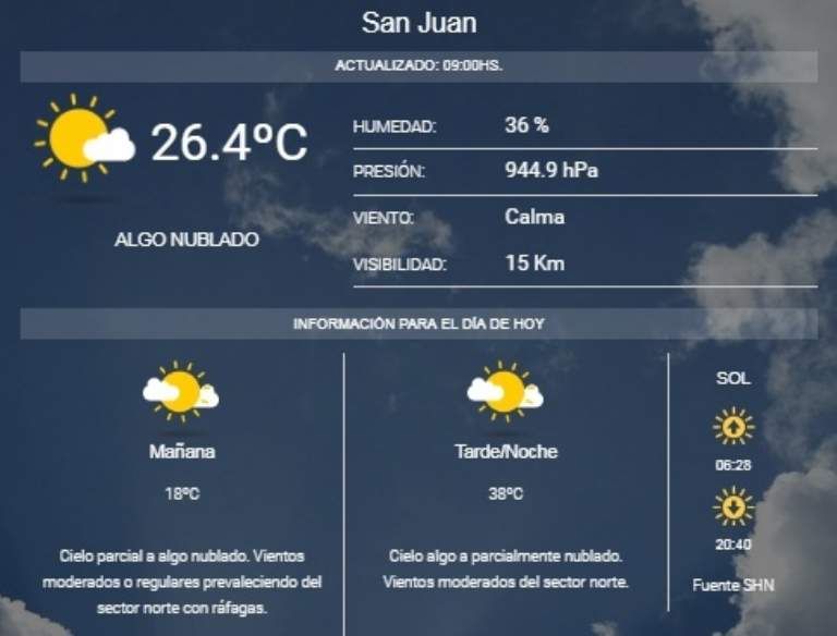 Este domingo, en San Juan habrá un denominador común y ese será el calor. Es que según prevé el Servicio Meteorológico Nacional, la máxima temperatura alcanzará los 38º y además de ello se espera la presencia de viento Zonda por la tarde.