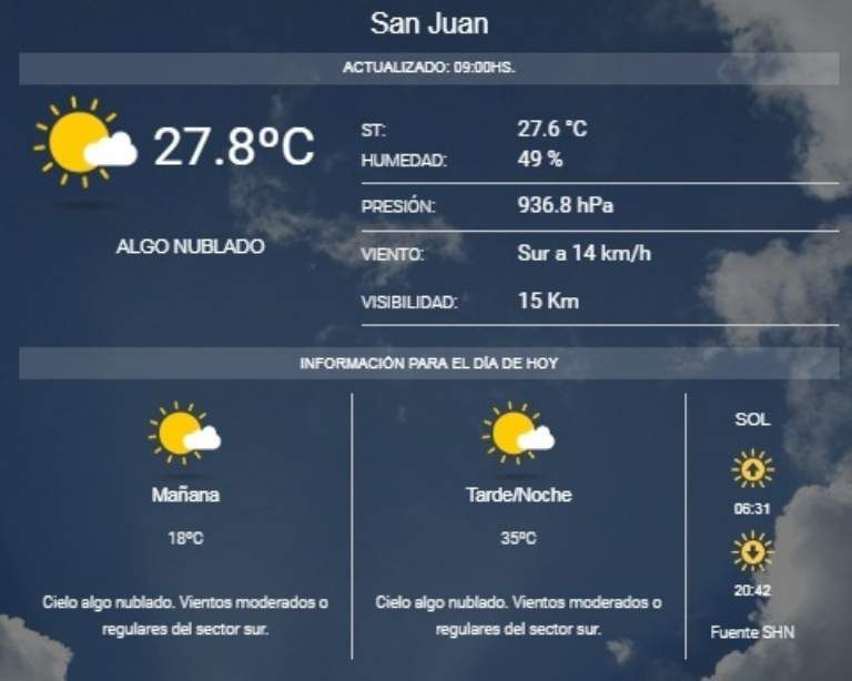 Sumida en una ola de calor desde hace varios días, San Juan alcanzará a una máxima temperatura de 35º según informó el Servicio Meteorológico Nacional, por lo que promete ser una jornada de mucho calor. La mínima, bien temprano, fue de 18º y ya hacía prever lo que después confirmó el ente nacional.