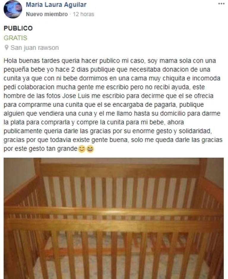 Esta mujer pidió en distintos grupos de Facebook ayuda para comprar una cunita para su bebé recién nacido y José Luis respondió con la ayuda monetaria para que María Laura la compre. Mirá el emotivo mensaje.