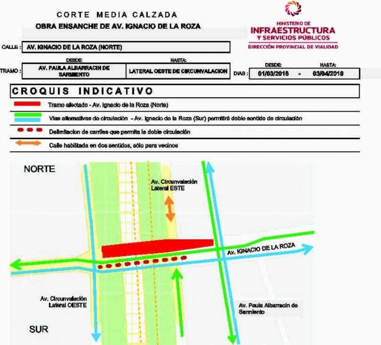 De acuerdo a lo informado por la Dirección Provincial de Vialidad, el corte de media calzada permanecerá hasta el miércoles 3 de abril y se realizará con motivo de las obras complementarias al ensanche de la avenida Ignacio de la Roza o Central.
