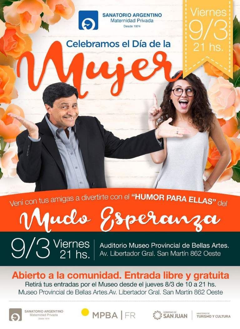El Sanatorio Argentino hará un encuentro especial para todas las mujeres sanjuaninas, para que festejen a pura carcajada su día. El evento será en el Museo Provincial de Bellas Artes, el próximo 9 de marzo a las 21, un día después del Día Internacional de la Mujer.