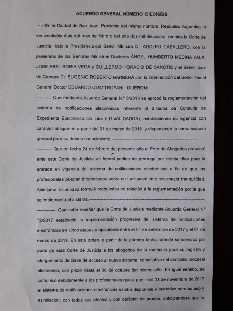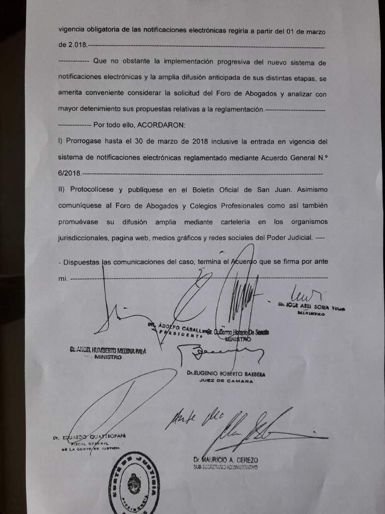 Por Acuerdo General N.º 6 de 2018 la Corte de Justicia aprobó la reglamentación referente a notificaciones electrónicas, la cual debía regir de manera obligatoria a partir del jueves 1 de marzo del corriente año en todos los órganos jurisdiccionales con excepción del Juzgado Comercial Especial, de aquellos que funcionan en los departamentos de 9 de Julio, 25 de Mayo, Ullum, Zonda, Angaco, San Martín, Iglesia, Pocito, Valle Fértil, Sarmiento, Albardón, Caucete y Calingasta, y del fuero Penal.