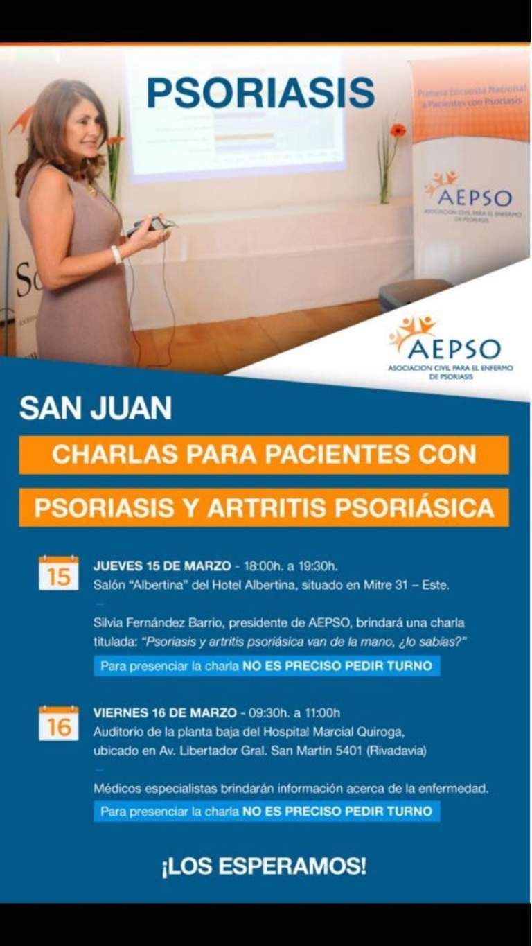Con el objetivo de colaborar con el diagnóstico temprano, se realizarán dos charlar abiertas y gratuitas a la comunidad, tituladas “Psoriasis y artritis psoriásica van de la mano. Las mismas estarán a cargo de Silvia Fernández Barrio y los médicos especialistas: Dr. Alejandro Navarta Ortiz, la Dra. Carolina Marchesi, la Dra. Yamila Amicarelli, la Dra. Romina Buenos y la Dra. Lourdes Alcaides. Para presenciar las charlas no es preciso pedir turno.