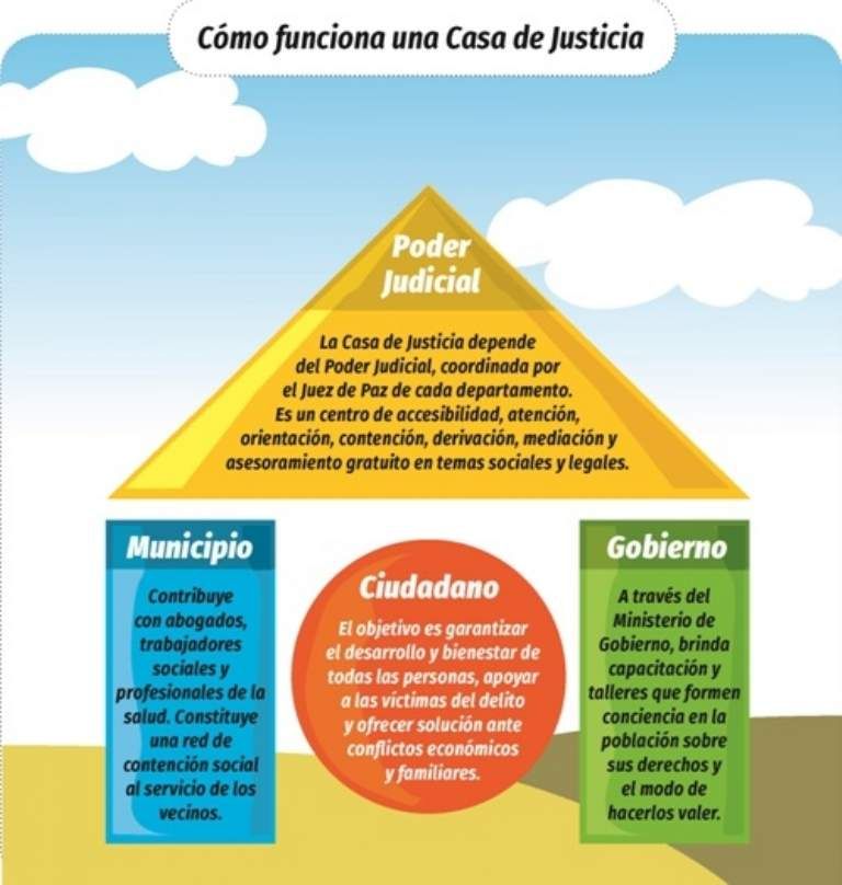 El programa Casa de Justicia tiene presencia, además de Rawson, en los departamentos Calingasta, Zonda, Valle Fértil, Sarmiento e Iglesia. Se trata de centros de accesibilidad dependientes del Poder Judicial y coordinados por cada juez de Paz, cuyo fin es brindar a los ciudadanos atención, orientación, asesoramiento y contención gratuitos ante problemas y conflictos sociales y familiares. Además del Poder Judicial, el programa se articula con el Municipio, el cual contribuye con profesionales de la salud, trabajadores sociales e infraestructura, y el Ministerio de Gobierno, fundamentalmente enfocado en el accionar de la policía y la implementación de capacitaciones y talleres sobre temas que hacen a la prevención y abordaje de las distintas problemáticas sociales y familiares.