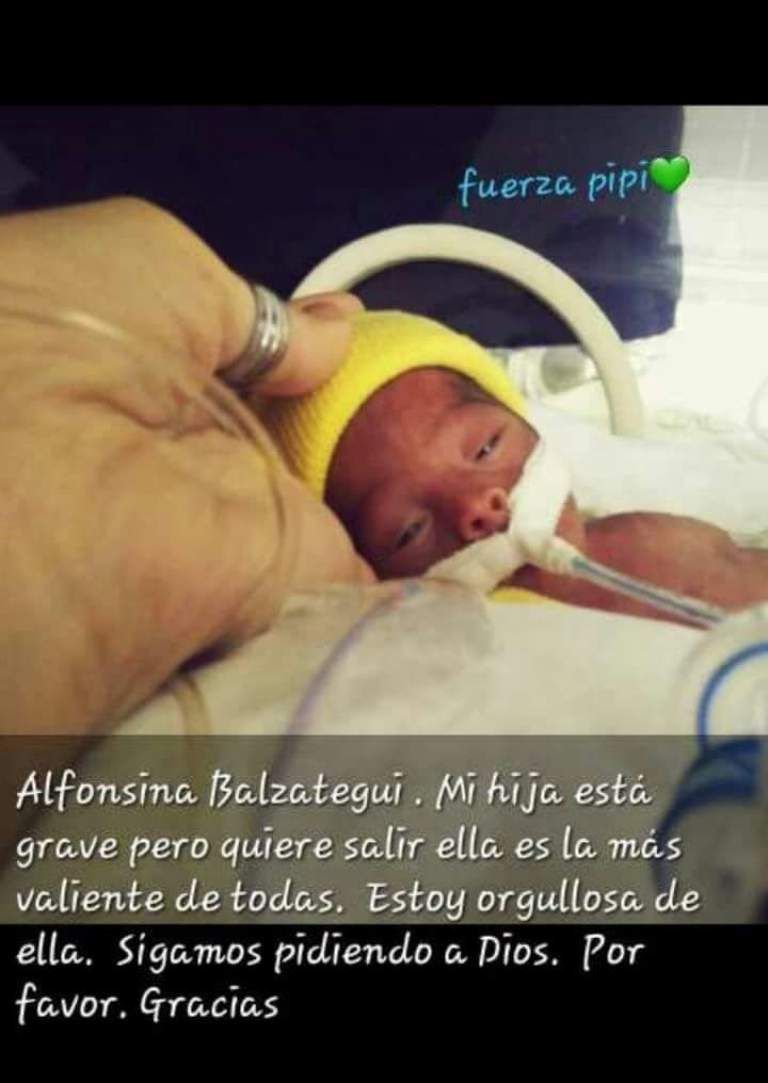 La pequeña Alfonsina, que nació el pasado 27 de febrero con tan solo 25 semanas de gestación y pesando 615 gramos, sigue peleando por su vida. Su estado de salud se agravó en las últimas horas y su madre Silvina Balzategui, familiares y amigos piden a todos que recen por su salud.
