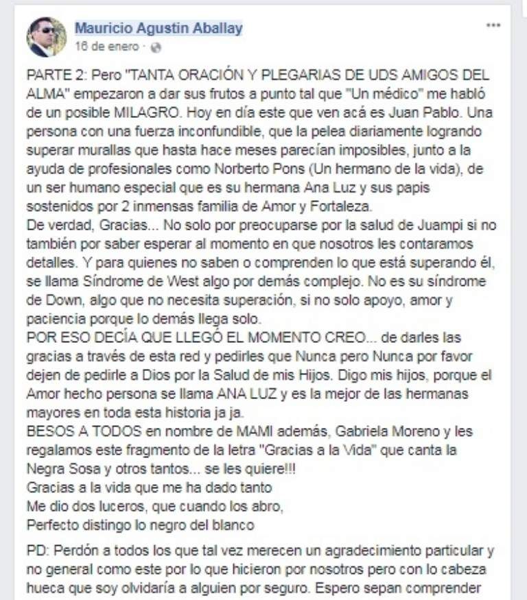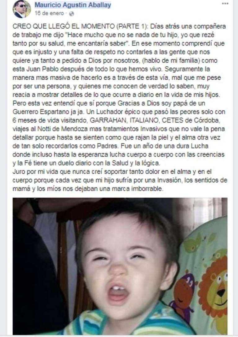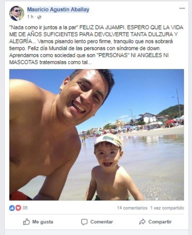 "Nada como ir juntos a la par" FELIZ DIA JUAMPI. ESPERO QUE LA VIDA ME DE AÑOS SUFICIENTES PARA DEVOLVERTE TANTA DULZURA Y ALEGRÍA... Vamos pisando lento pero firme, tranquilo que nos sobrará tiempo. Feliz día Mundial de las personas con síndrome de down. Aprendamos como sociedad que son "PERSONAS" NI ANGELES NI MASCOTAS tratemoslas como tal..." El emotivo mensaje lo publicó, en el Día de las Personas con Síndrome de Down, el periodista sanjuanino Mauricio Aballay, padre de Juampi.