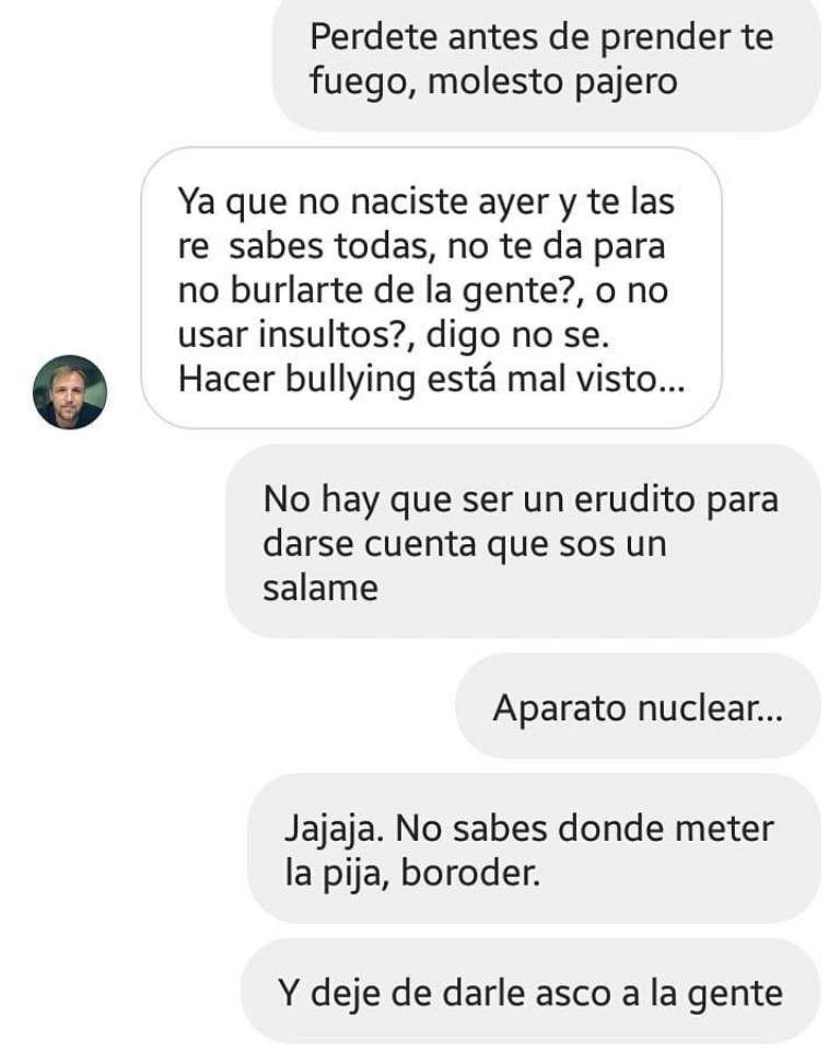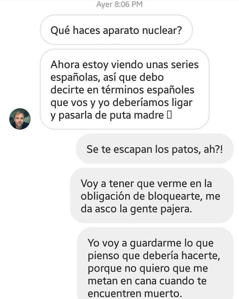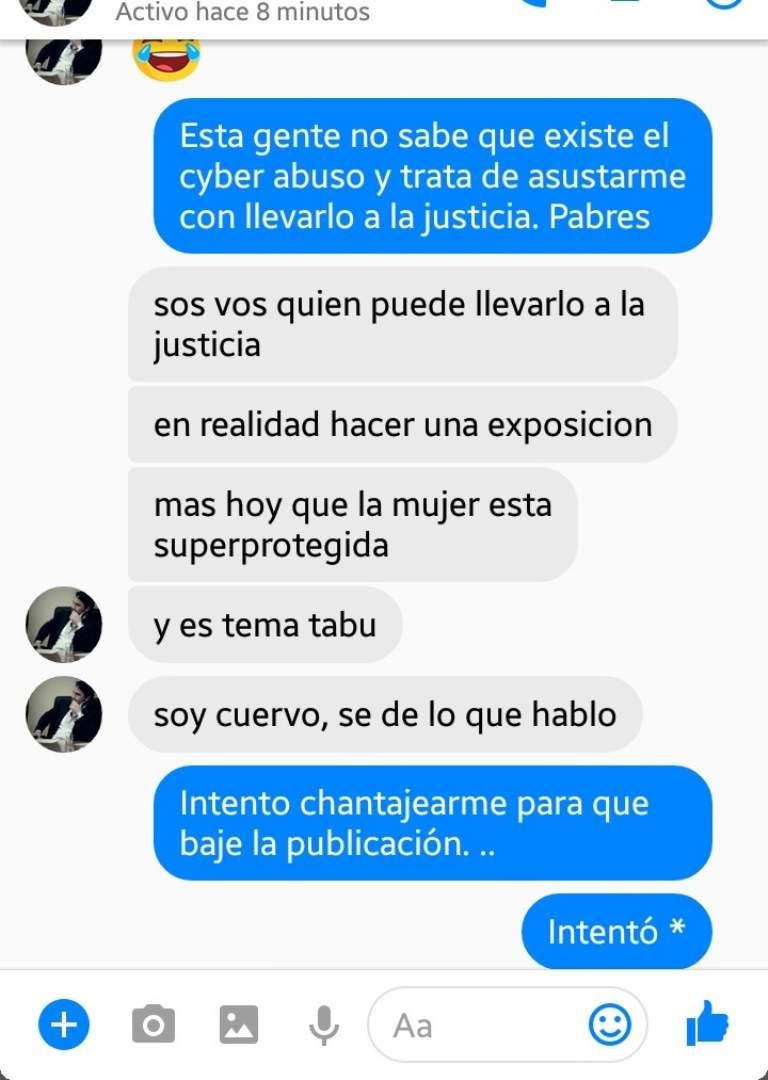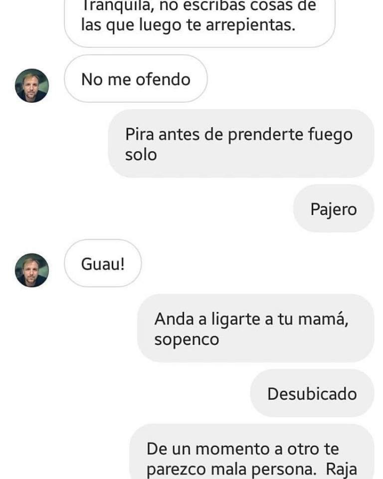 “Estoy soltero, chateas con tus contactos. Ella era una chica con la que había chateado antes cuando trabajaba en la Fiesta del Sol pero charlas amistosas. El día que murió Stephen Hawking puse un estado de Facebook que ella contestó con mala onda. El domingo le tiro un mensaje que estaba mirando una serie española y le digo: -Ahora estoy viendo unas series españolas que vos y yo deberíamos ligar y pasarla de la puta madre. Esa frase nada tiene que ver con una propuesta sexual”, añadió el realizador visual.
