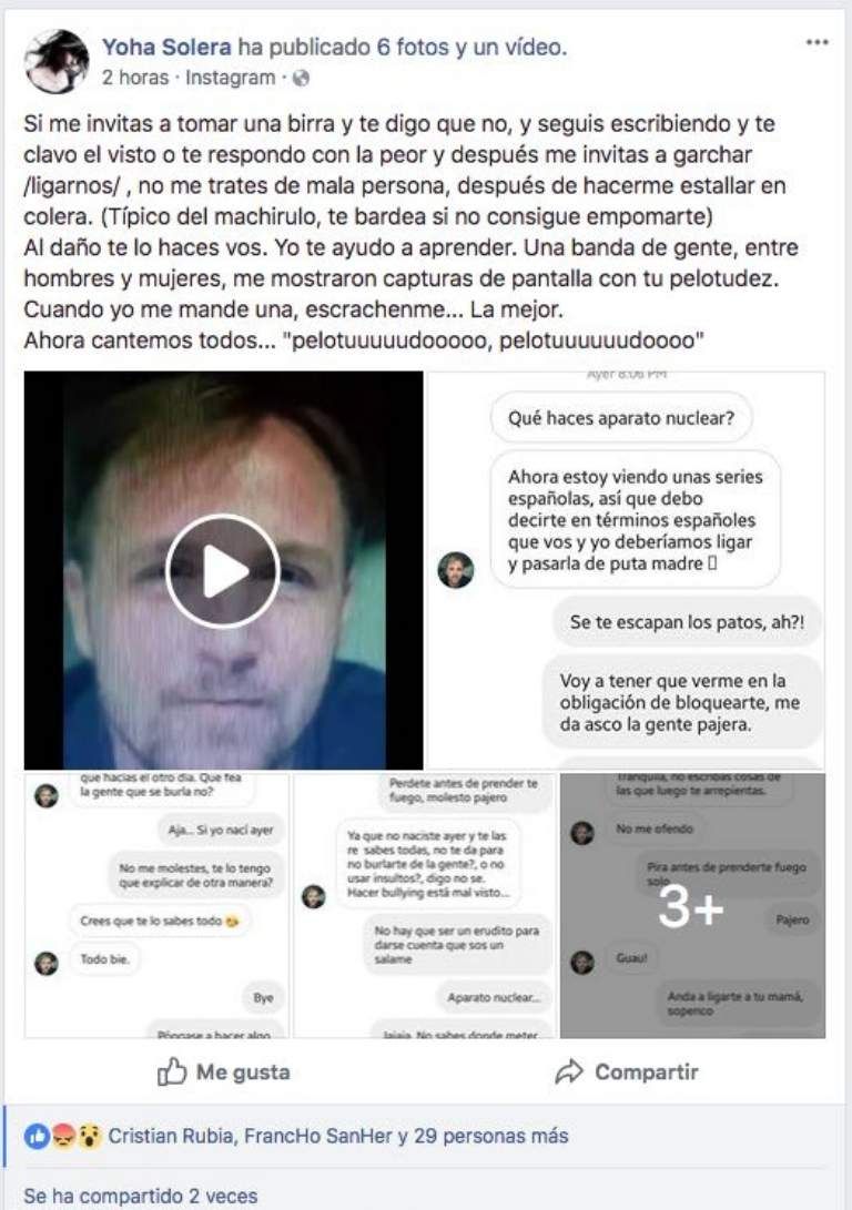 Un escrache público hizo estallar las redes sociales en San Juan. Una actriz, Yohana Solera, denunció en su Facebook al realizador visual Andrés Jones. La joven dice haber sido acosada a través de chats. Ante la repercusión del caso, Jones decidió hablar, se defendió y dijo que lo único que hizo fue invitar a salir a alguien, que Solera malinterpretó el mensaje enviado por él ya que la palabra “ligar” en España implica una invitación.