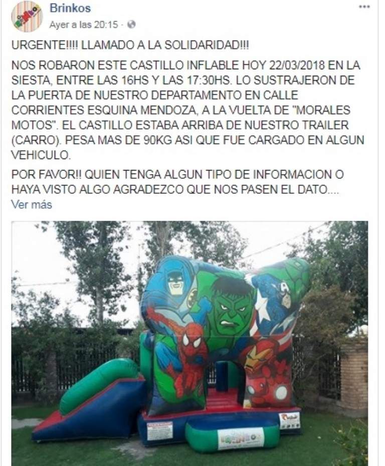 Con una descripción muy específica de su elemento de trabajo, la dueña del servicio para fiestas infantiles publicó lo siguiente: "nos robaron este castillo inflable. Estaba arriba de nuestro trailer, pesa más de 90 kg así que fue cargado en algún vehículo. Por favor quien tenga algún tipo de información o haya visto algo agradezco que nos pasen el dato. El castillo es “único” en San Juan, no lo tiene nadie más y tiene cosido de fabrica el logo de nuestra empresa “brinkos” con nuestros números, y el logo del fabricante. No van a poder venderlo ni alquilarlo, ya que nadie más lo tiene en todo San Juan. Además se lo robaron sin turbina y no cualquier turbina lo puede inflar debido a la dimensión del castillo, ya está hecha la denuncia en la comisaria 2da de Concepción”.