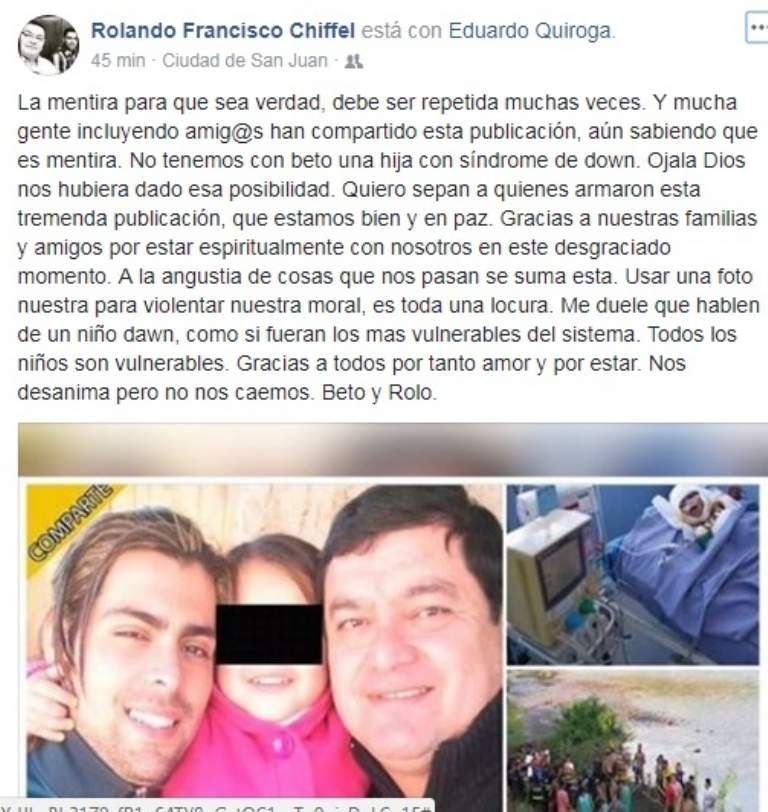 El sitio www.noticiasviral24.com publicó una noticia falsa de una pareja gay sanjuanina, integrada por el reconocido periodista Rolando Chiffel y Beto. El medio aseguró que el matrimonio abusó y abandonó a una niña con Síndrome de Down que habían adoptado.