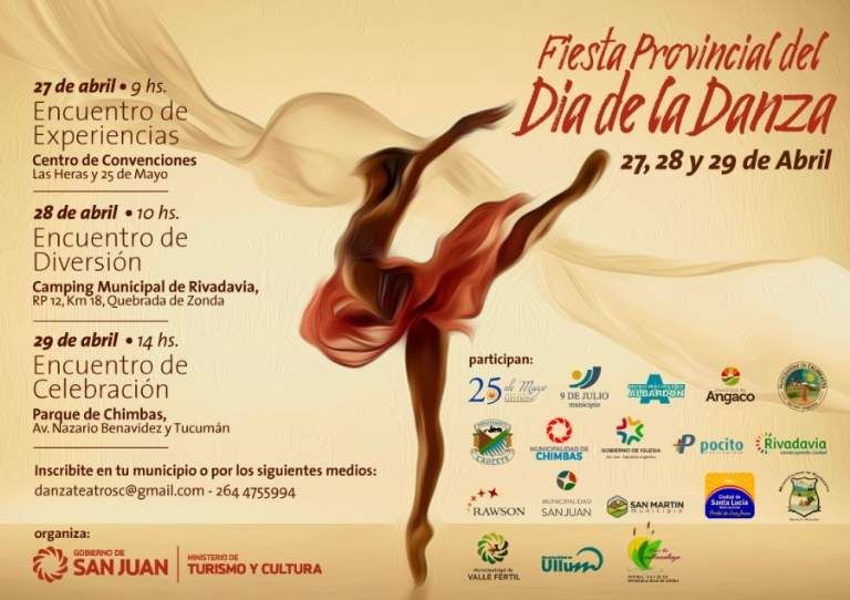 La Fiesta Provincial del Día de la Danza comenzará el viernes 27 y culminará el domingo 29 de abril con un mega evento a desarrollarse en el Parque de Chimbas. Durante estos días habrá diversas actividades, que incluirán capacitaciones y jornadas recreativas, todo libre y gratuito.