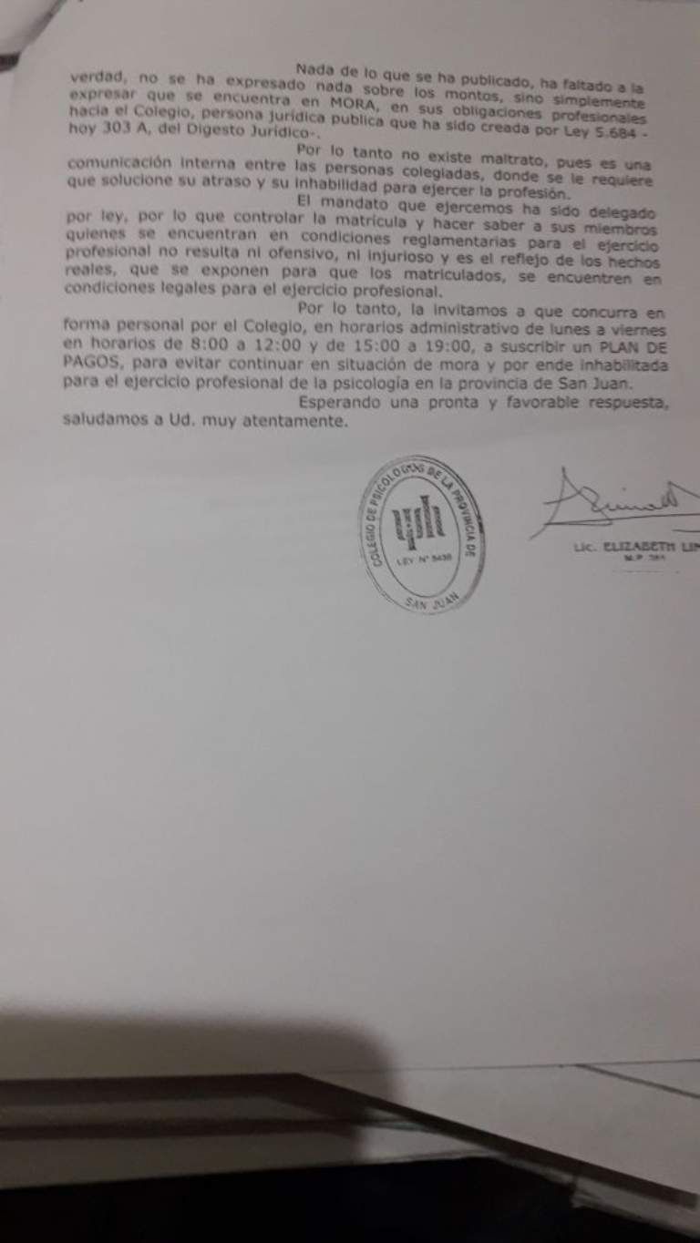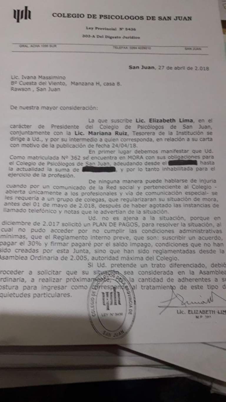 Todo empezó cuando la asociación publicó en Facebook el listado de los profesionales que adeudan cuotas y donde aseguraban que iban a sufrir inhabilitaciones de no regularizar la situación. Una de las escrachadas, la profesional Ivana Massimo, envió una carta documento tras ver su nombre publicado. La respuesta del Colegio no se hizo esperar, pero en lugar de retractarse le comunicaron que había quedado inhabilitada.