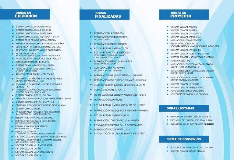 Actualmente en agua potable hay un trabajo estrella que tiene que ver con el Acueducto Gran San Juan, cuyos sobres de la licitación de la obra civil se abrirán este jueves. La idea es que esté comenzando en unos tres meses, en agosto, aproximadamente. La obra civil contempla la planta en el dique Punta Negra e instalar cañerías en más de 65 kilómetros hacia los acueductos. Los trabajos están pensados para el San Juan del millón de habitantes. El Acueducto Gran San Juan contempla 8 acueductos complementarios.